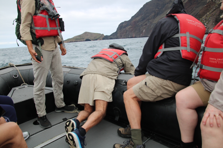As we returned to the ship our guide conducted a measurement of visibility at depth. This showed that below 5m visibility was zero because of the plankton growth at the junction of the Humbolt and Equatorial currents. This may be good for fish and sea animals but not for our next activity conducted upon a glass bottomed boat. A highlight however, was that we saw more birds including a pair of Noddy terns building a nest.